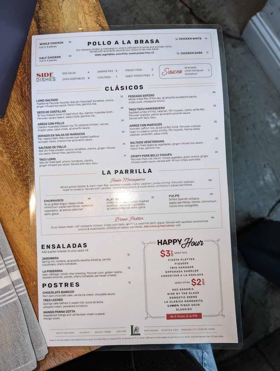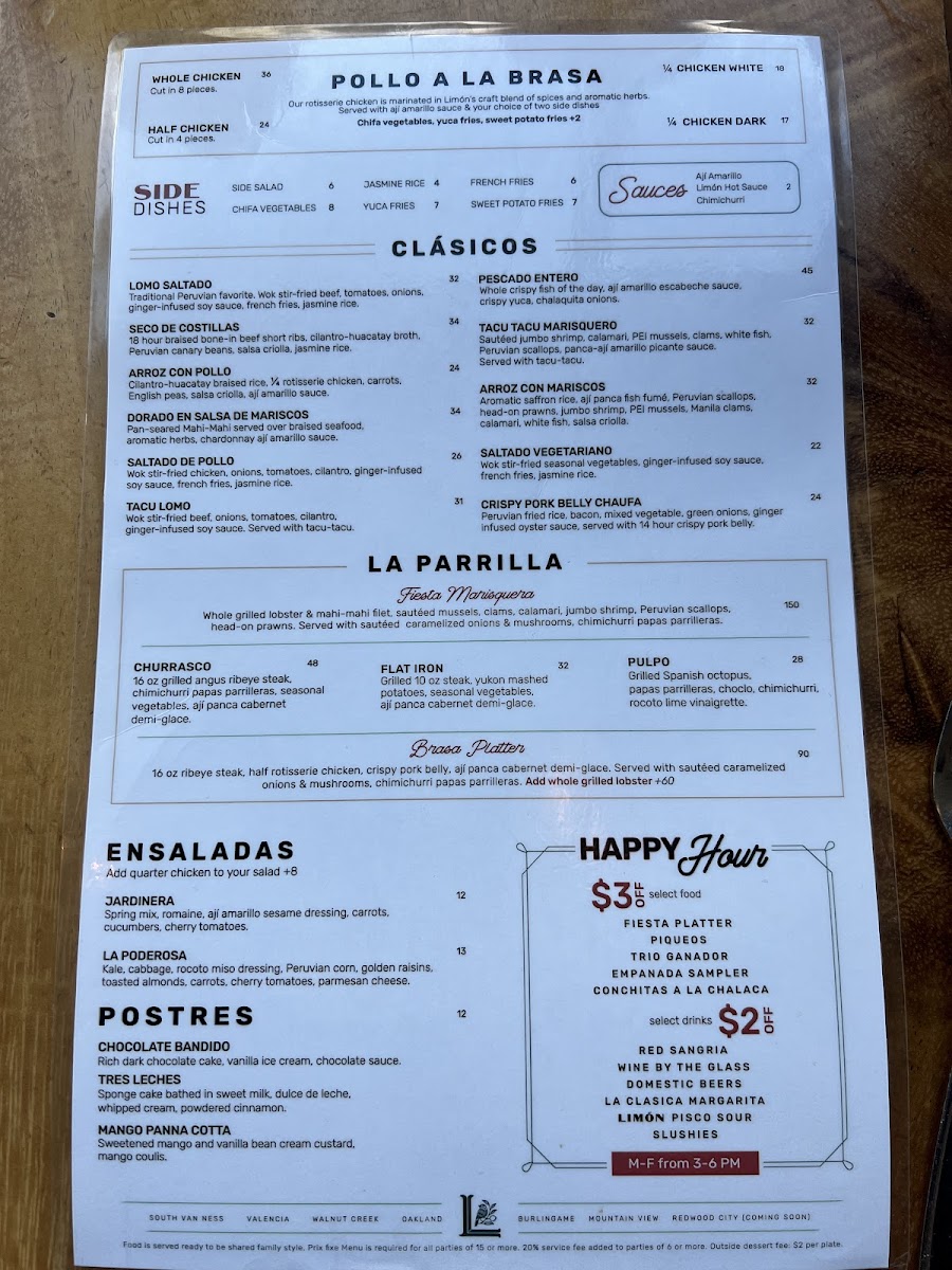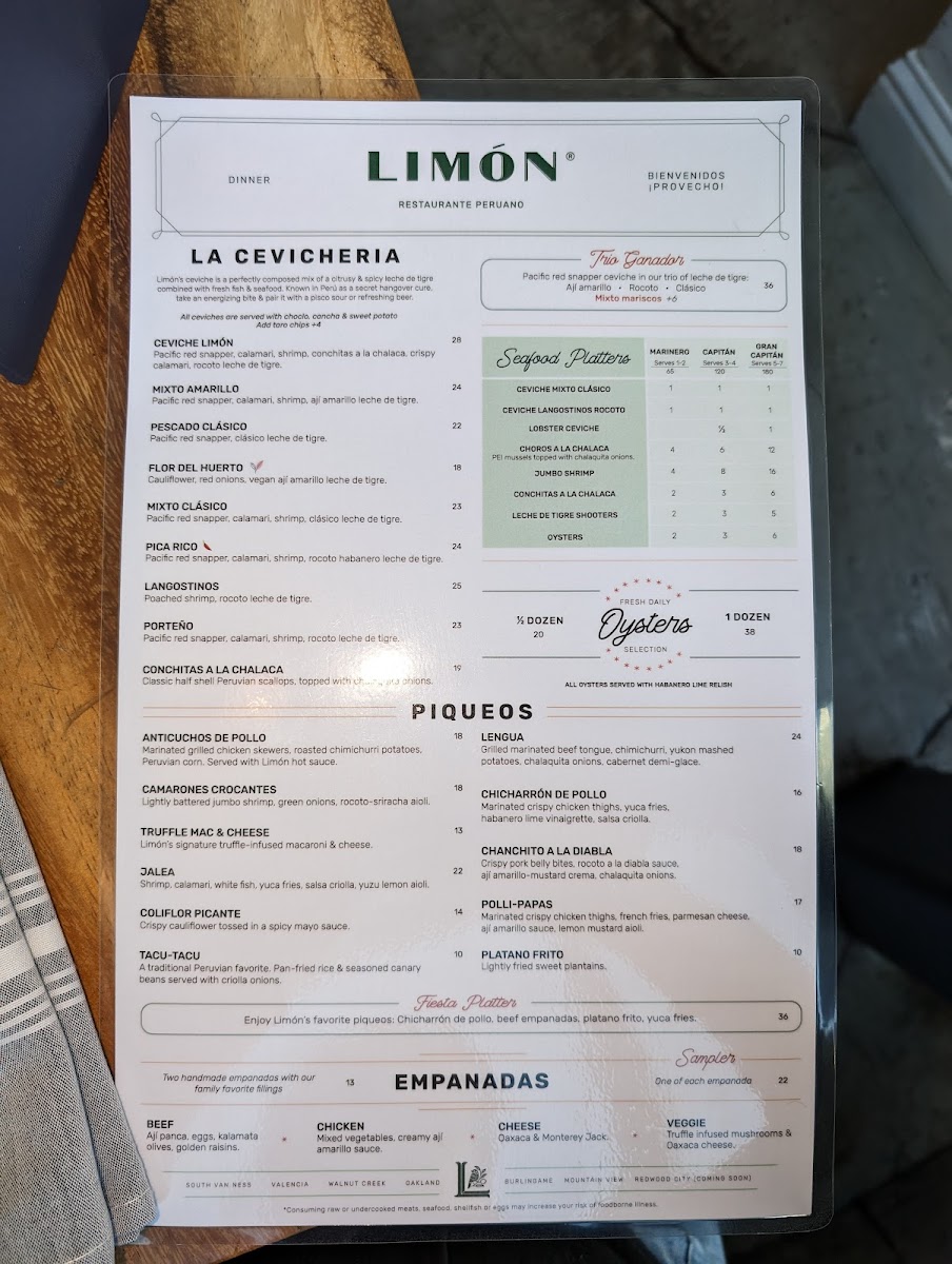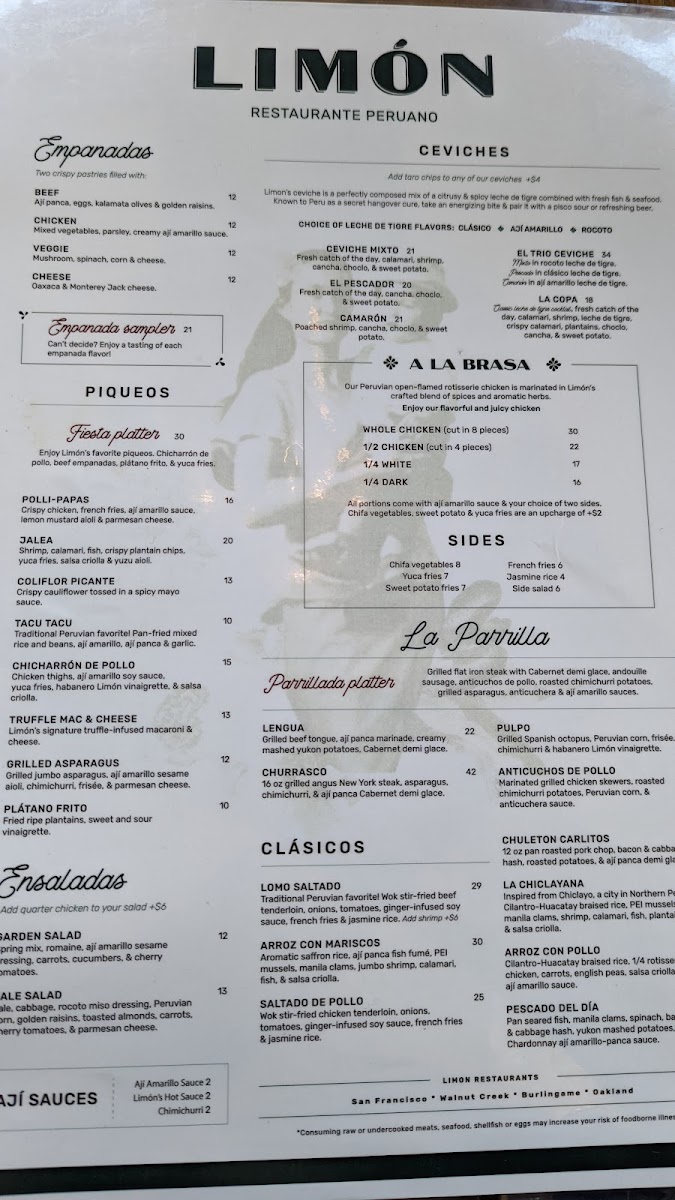 Introducing the menu at Limón - Oakland is a culinary journey through the vibrant flavors of Peru, celebrated in a lively atmosphere. Their offerings begin with ceviches, showcasing fresh catches of the day enlivened withrocoto and ají amarillo leche de tigre. The El Trio Ceviche Mixto stands out, presenting a trio of savory options for $34, including pescado marinated to perfection. For those seeking something heartier, the La Copa, featuring a zesty milk-base cocktail with calamari and shrimp, is a must-try at $18. Desserts like the rich Chocolate Bandido and classic Tres Leches complete the meal on a sweet note. Don’t miss their signature Pisco Sours, which elevate the dining experience further. Overall, Limón - Oakland balances delicious, authentic dishes with a lively energy, making it a standout dining destination in the heart of Oakland.