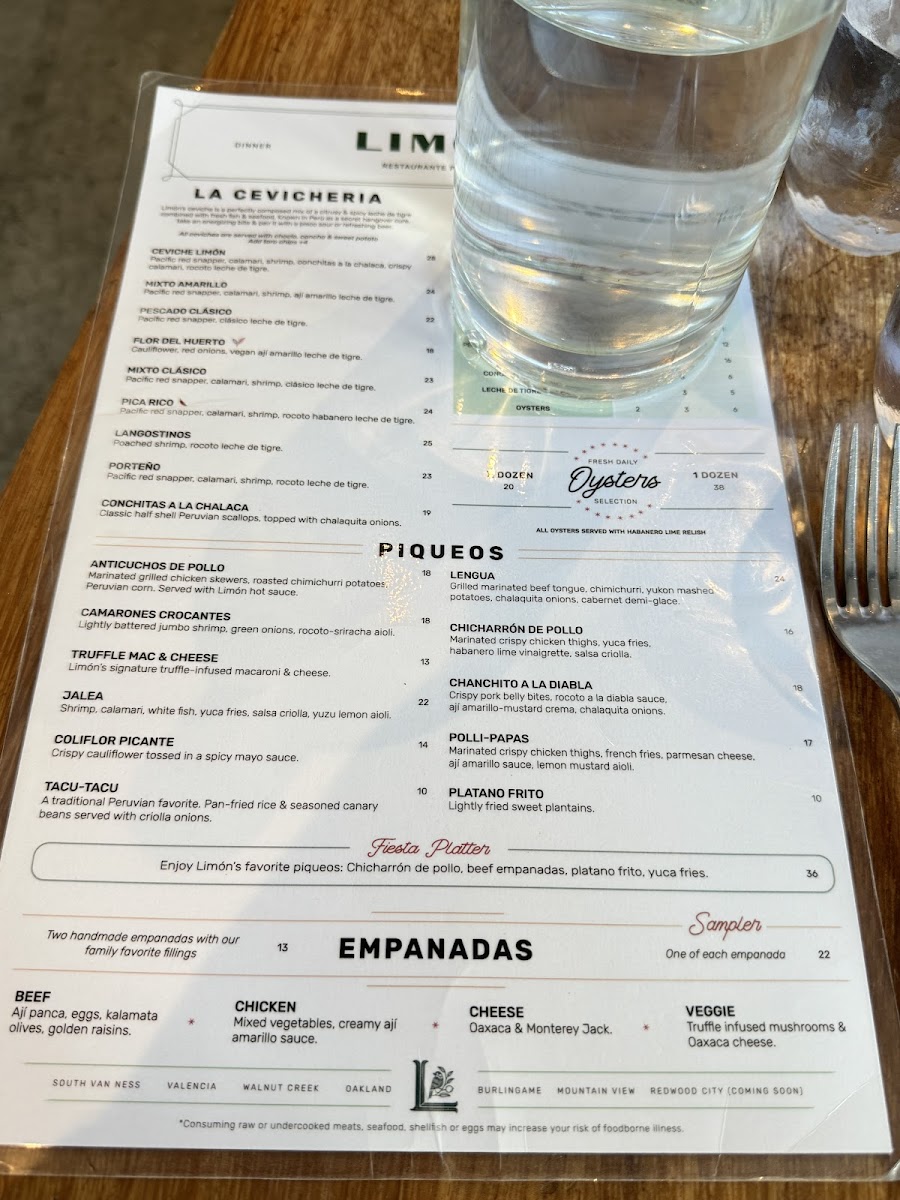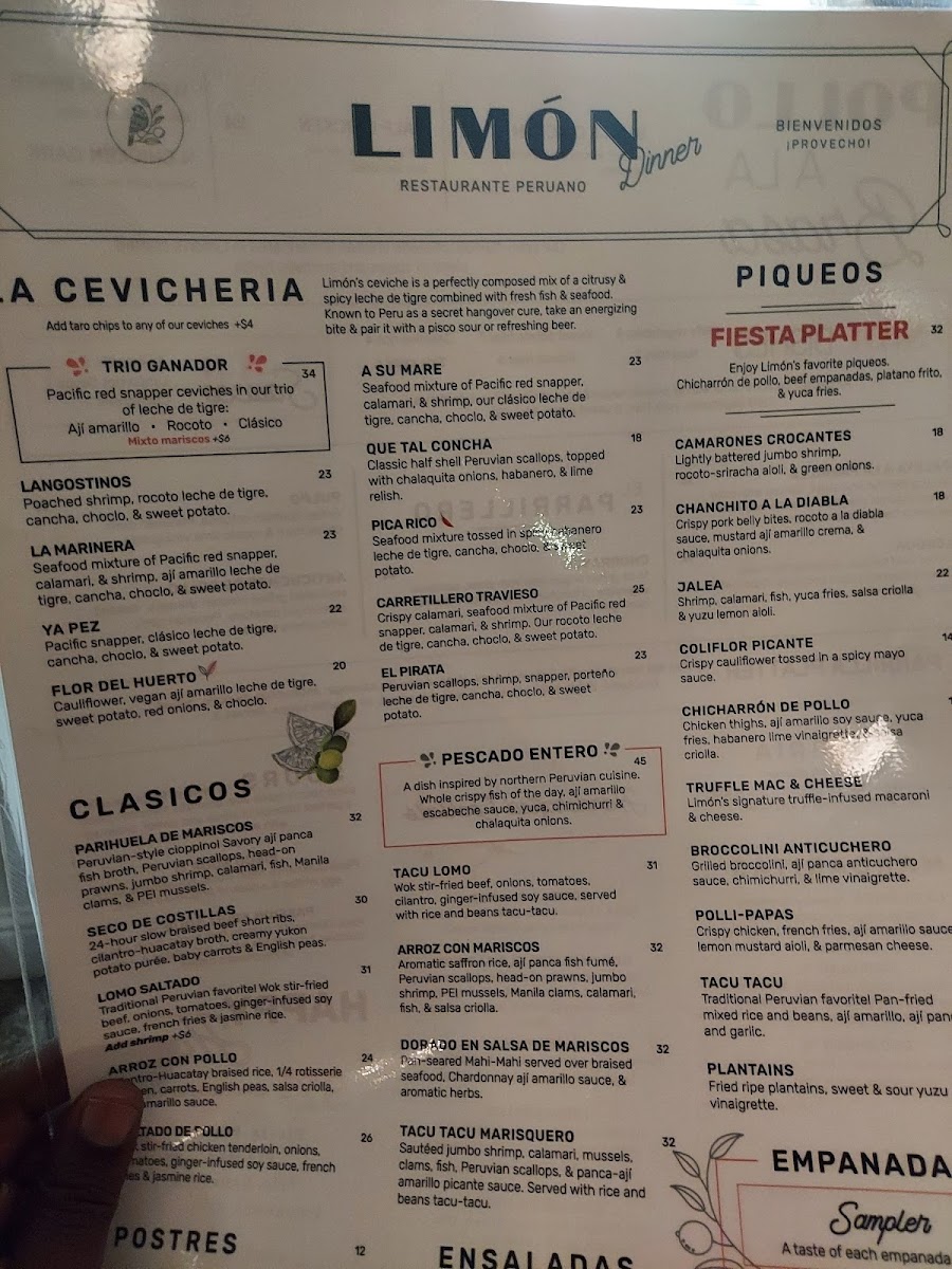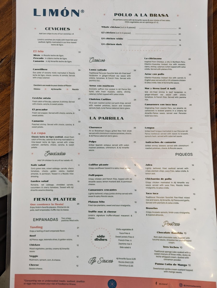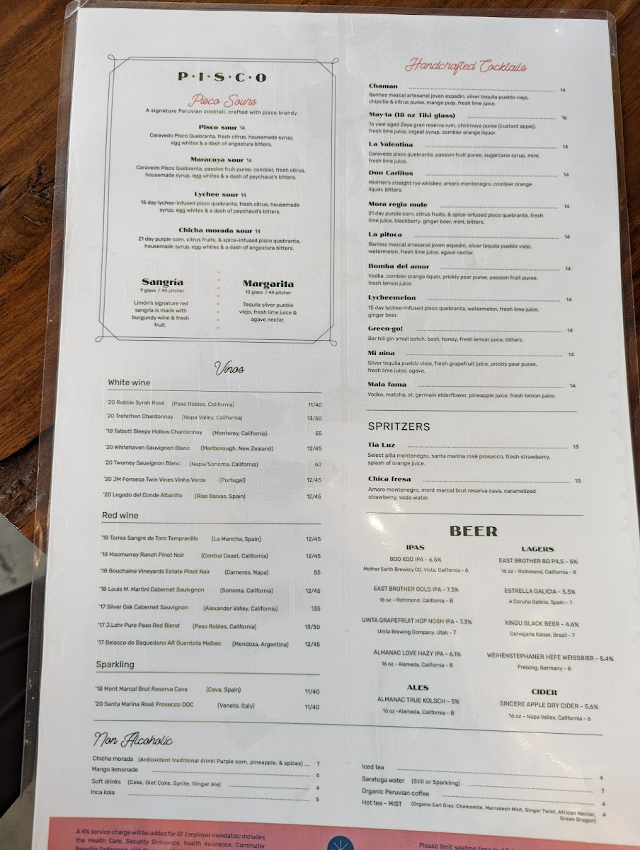 Introducing the menu at Limón - Oakland is a culinary journey through the vibrant flavors of Peru, celebrated in a lively atmosphere. Their offerings begin with ceviches, showcasing fresh catches of the day enlivened withrocoto and ají amarillo leche de tigre. The El Trio Ceviche Mixto stands out, presenting a trio of savory options for $34, including pescado marinated to perfection. For those seeking something heartier, the La Copa, featuring a zesty milk-base cocktail with calamari and shrimp, is a must-try at $18. Desserts like the rich Chocolate Bandido and classic Tres Leches complete the meal on a sweet note. Don’t miss their signature Pisco Sours, which elevate the dining experience further. Overall, Limón - Oakland balances delicious, authentic dishes with a lively energy, making it a standout dining destination in the heart of Oakland.